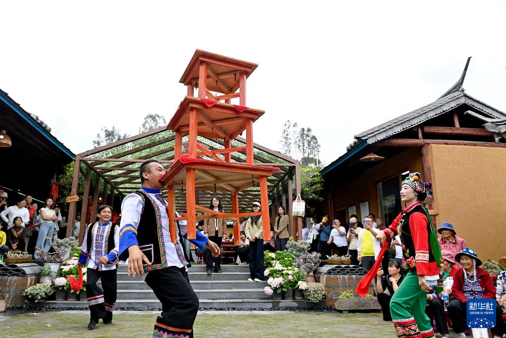 5月2日,在云南省大理南涧彝族自治县南涧镇西山跳菜村,跳菜队员在展示国家级非物质文化遗产代表性项目南涧彝族跳菜。新华社发(适志宏摄)