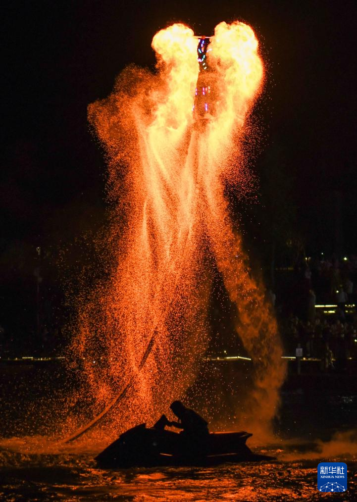 5月2日,在四川省阆中市嘉陵江水面,“水上飞人”为游客表演飞天火壶。新华社发(王玉贵摄)