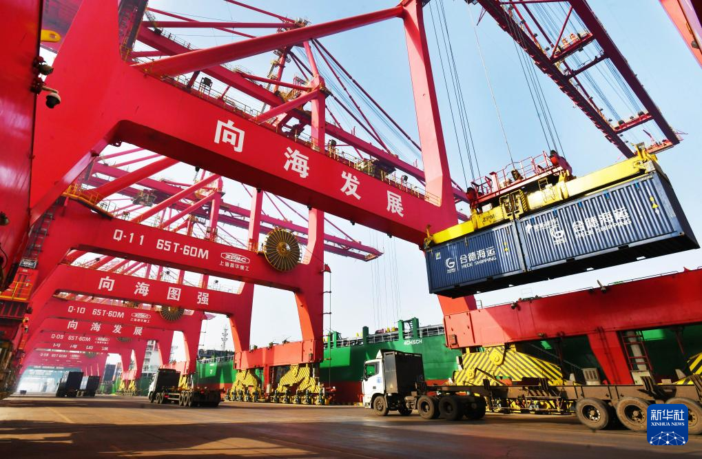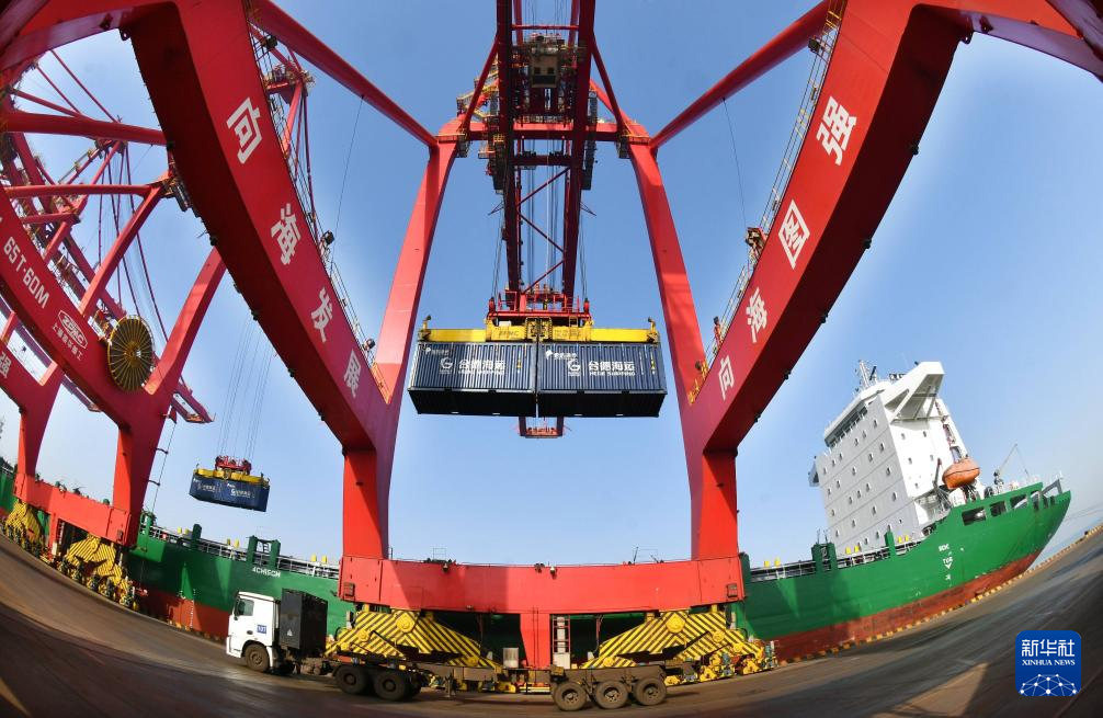 1月15日,在黄骅港综合港区集装箱码头,岸桥设备在进行卸船作业。新华社发(苑立伟 摄)