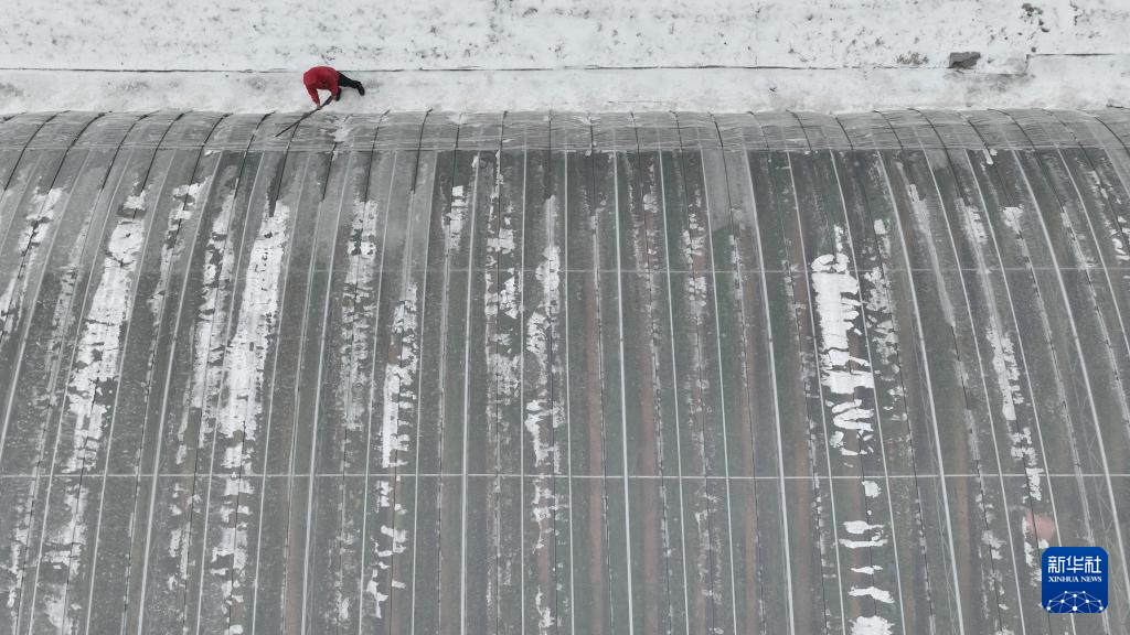 1月19日,在山东省邹平市青阳镇化庄村,菜农在清理大棚上的积雪(无人机照片)。新华社发(董乃德摄)