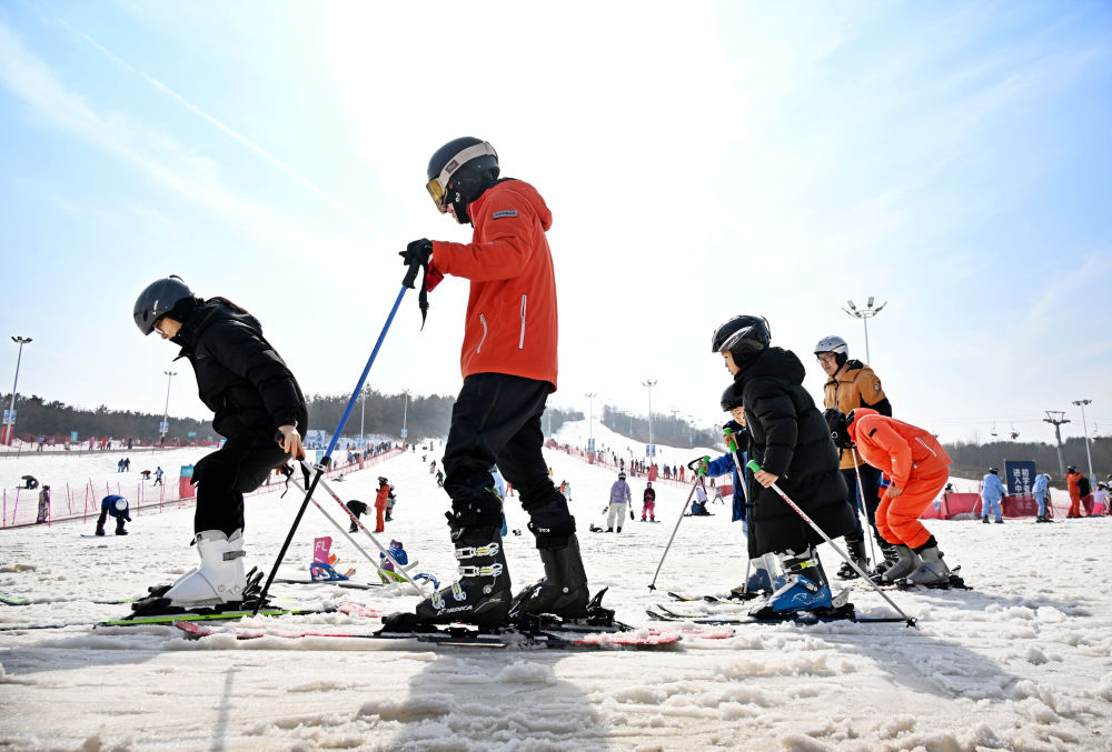 2026年2月13日,游客在青岛西海岸新区融创藏马山滑雪场学习滑雪。