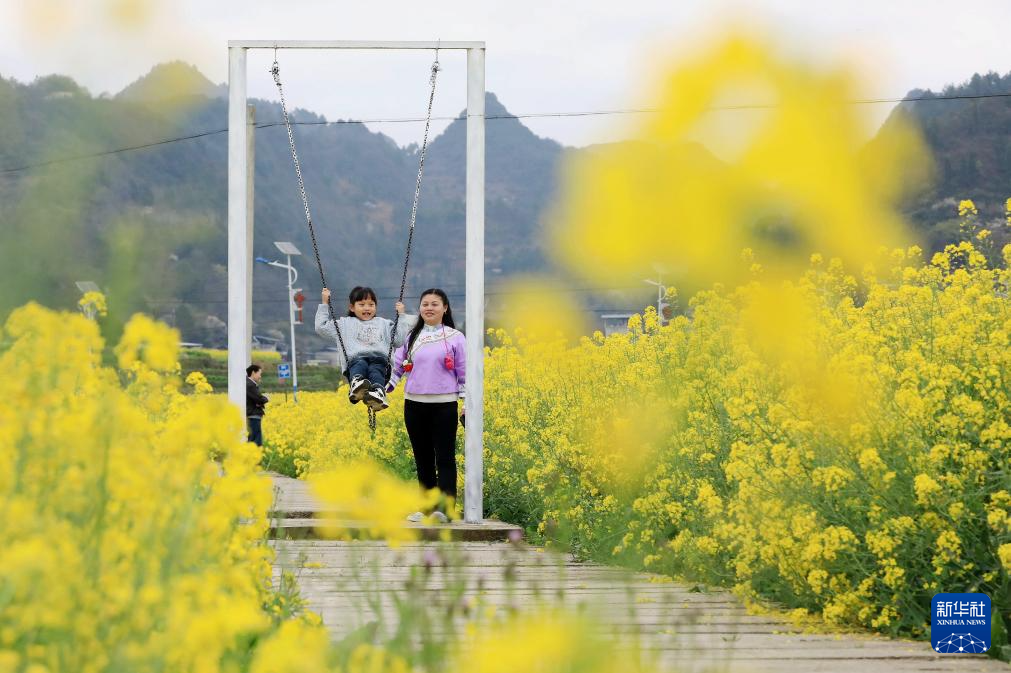 3月21日,在贵州省黔东南苗族侗族自治州施秉县城关镇上翁哨村,家长陪同孩子在油菜花田间荡秋千。新华社发(邰胜智 摄)