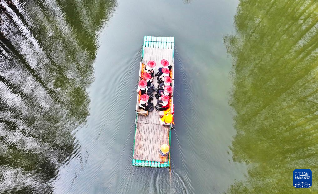 3月22日,人们在江苏省淮安市金湖县水上森林公园乘竹筏(无人机照片)。新华社发(梁德斌摄)