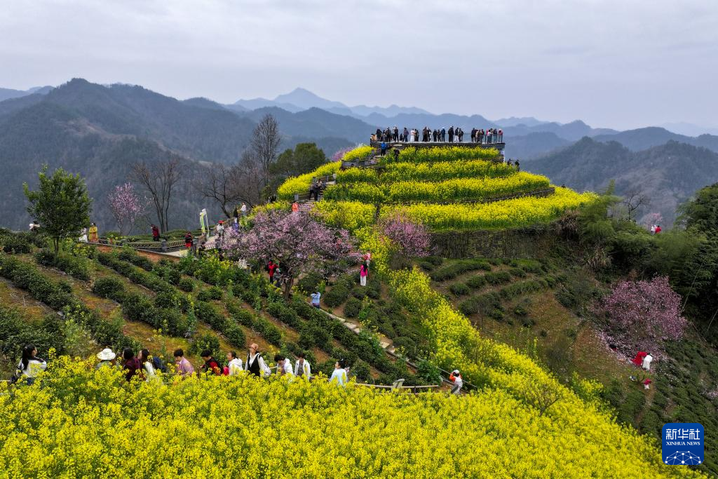 3月22日,游人在安徽省黄山市歙县霞坑镇石潭村春游赏花(无人机照片)。新华社发(樊成柱摄)