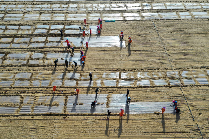 在新疆和田地区于田县沙产业实验基地,当地群众在种植薏米(2025年4月8日摄,无人机照片)。新华社记者 丁磊 摄