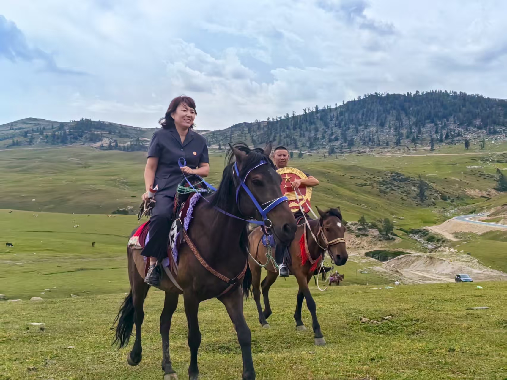 今年7月,热依扎·马迪汗骑马在牧区向游客开展普法宣传。 石榴云/新疆法治报记者 古雪丽摄