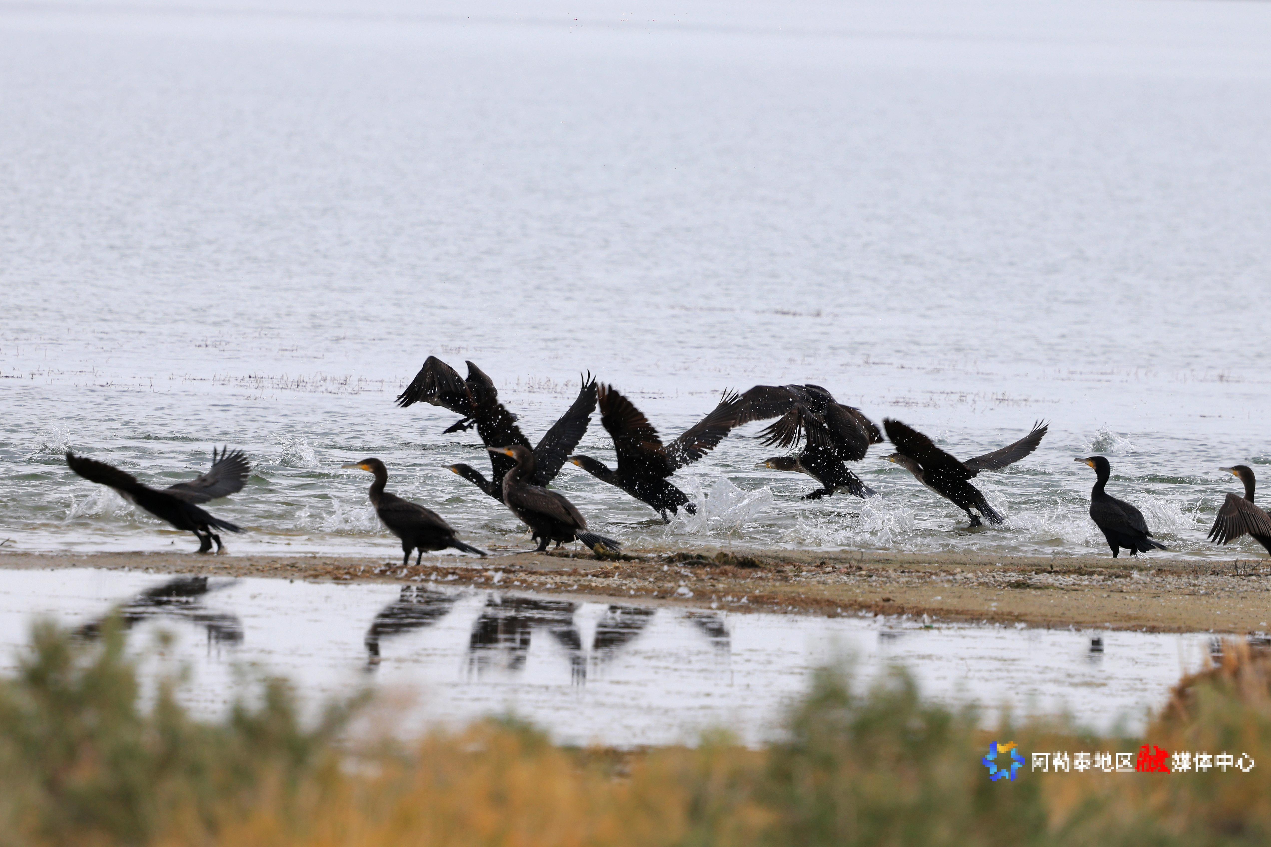 湖面上,成群的天鹅与鸬鹚悠然游弋,时而在水面觅食,时而展翅低飞,为宁静的湖面增添了几分生机。湖畔的沙滩上,骆驼悠闲踱步,与远方的雅丹地貌相映成趣,为游客们提供了多样化的观赏体验。