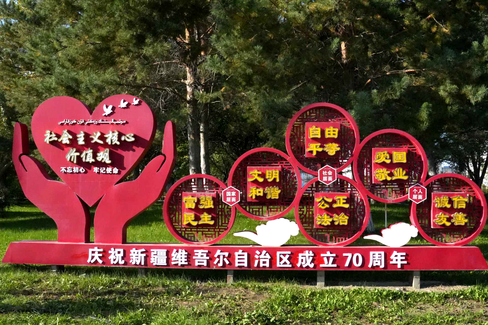 县人民路、团结路等主干道的路灯杆上,鲜艳的五星红旗迎风飘扬;沿街商铺门前悬挂起串串大红灯笼,各机关单位门口摆放着以“庆祝自治区成立70周年”为主题的花坛,色彩绚丽、主题鲜明。夜幕降临后,缤纷的彩灯依次点亮,把县城装扮得流光溢彩,许多居民驻足观赏、拍照留念,记录这喜庆美好的时刻。