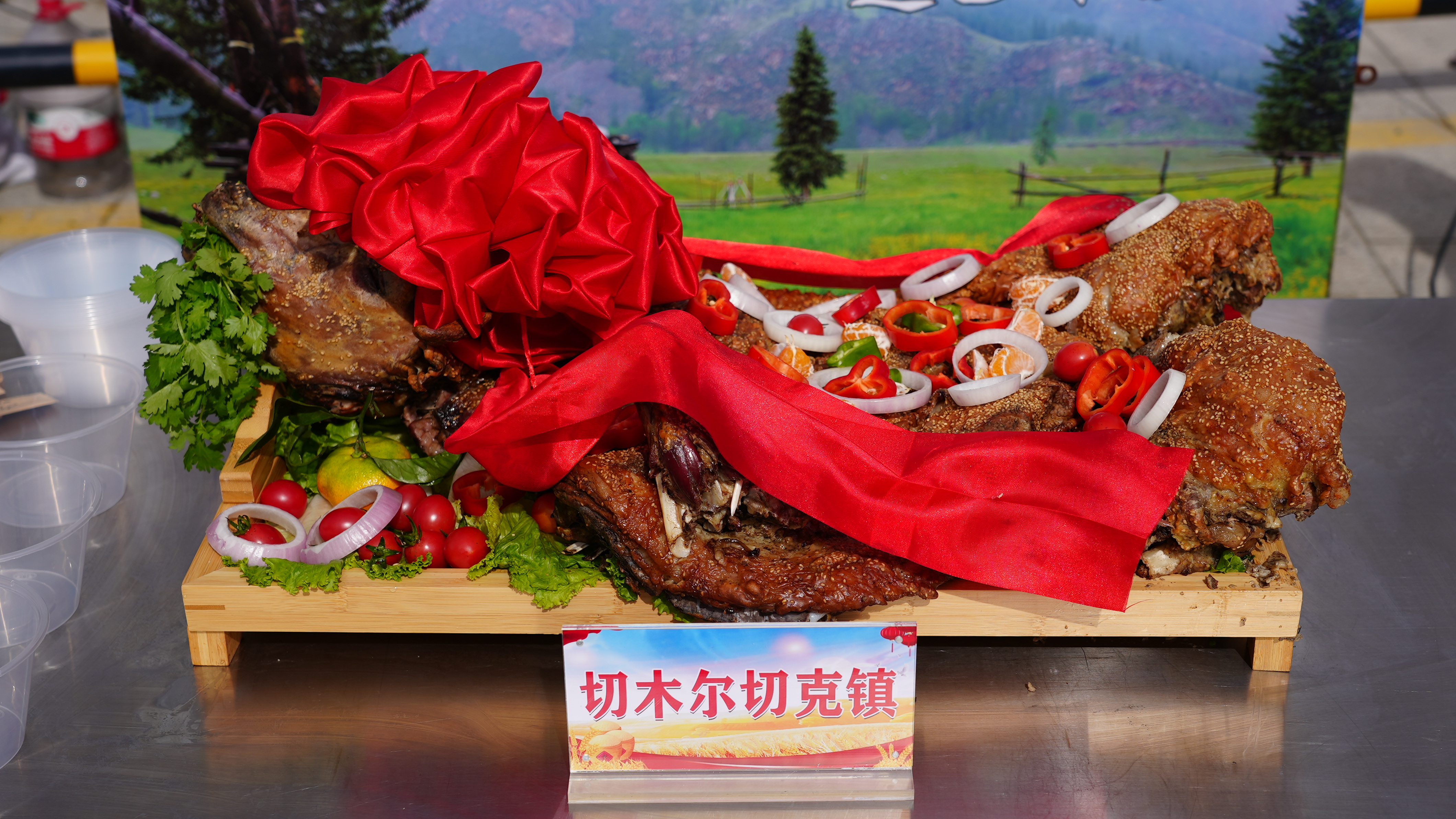 “装饰”环节是阿勒泰人热爱生活的生动写照。翠绿的香菜塞进羊嘴,宛如羊儿衔着山野的生机;羊头戴上喜庆的大红花,洋葱圈码在羊身两侧,象征“团圆圆满”;辣椒圈点缀其间,寓意生活“红红火火”;白菜片在羊腹铺成扇形,表达“百财兴旺”的吉祥愿景。