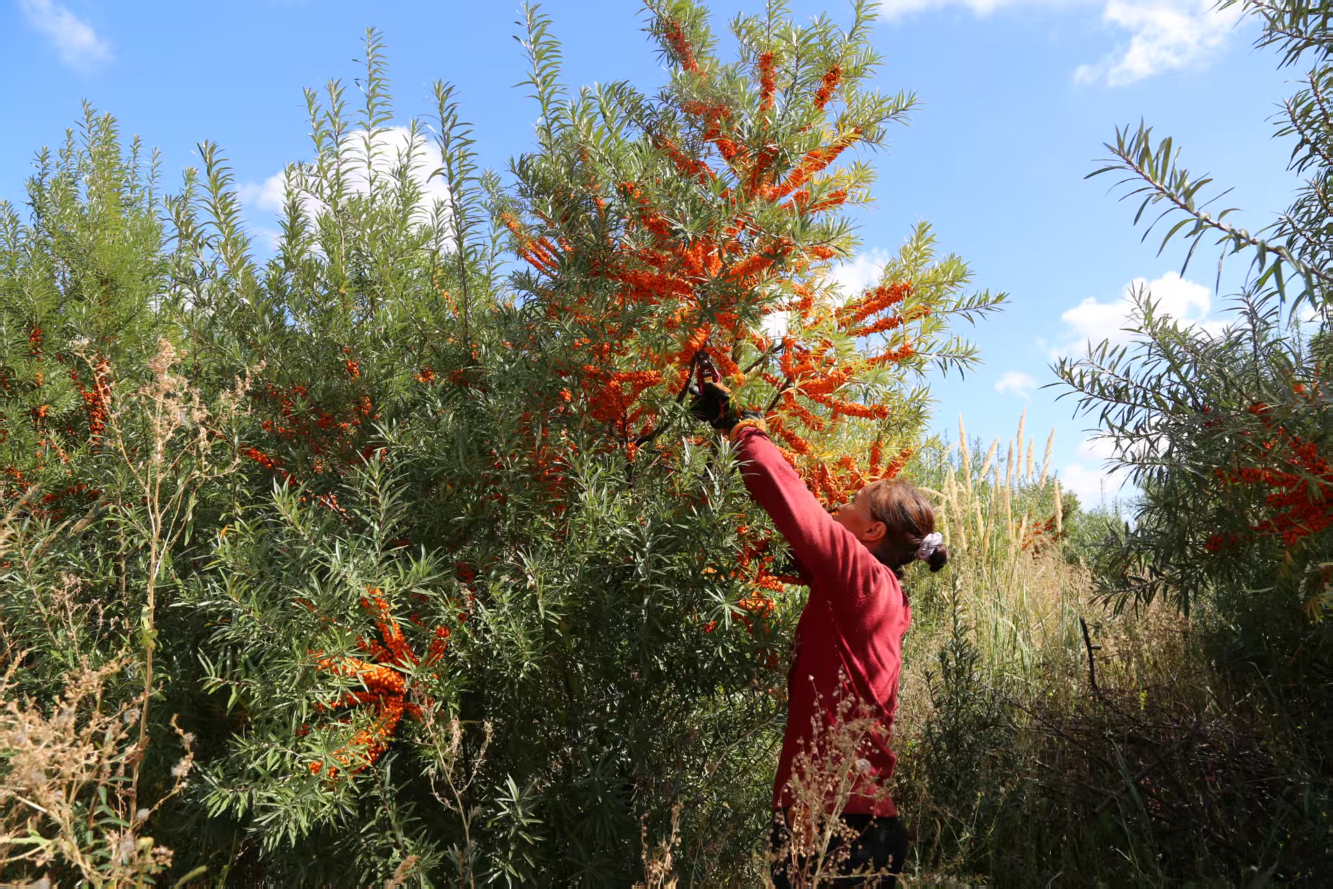 村民在采摘沙棘。