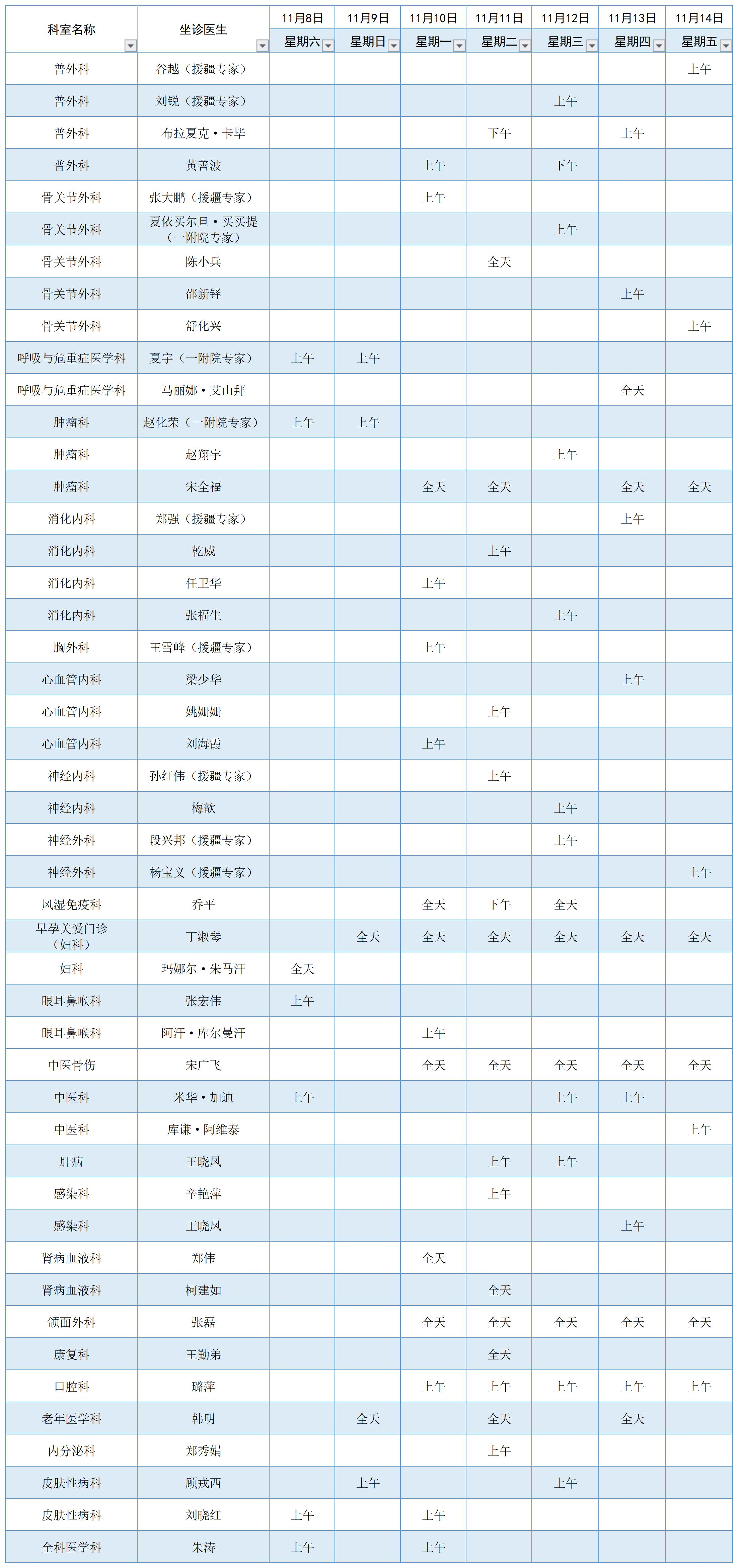 阿勒泰地区人民医院11月8日至14日专家门诊坐诊表