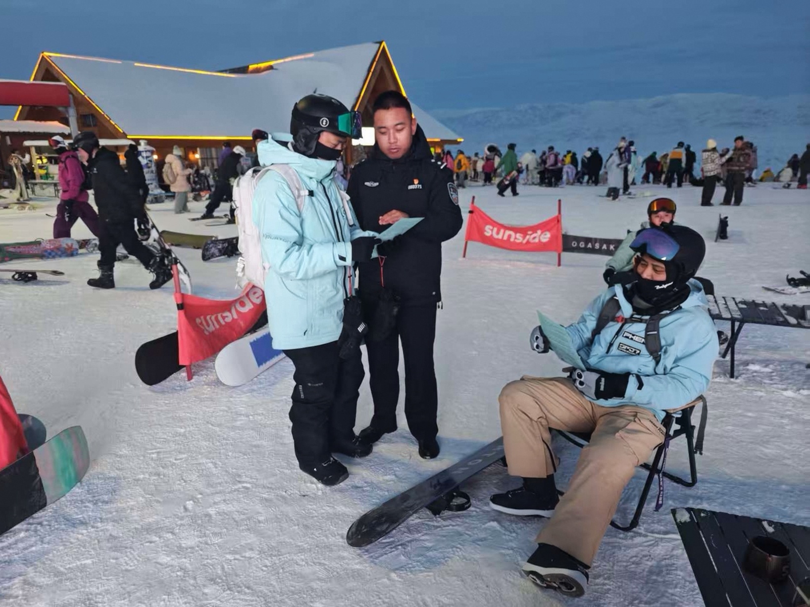 阿勒泰市公安局解放路街道派出所民警在阿勒泰将军山国际滑雪度假区开展精准反诈宣传。