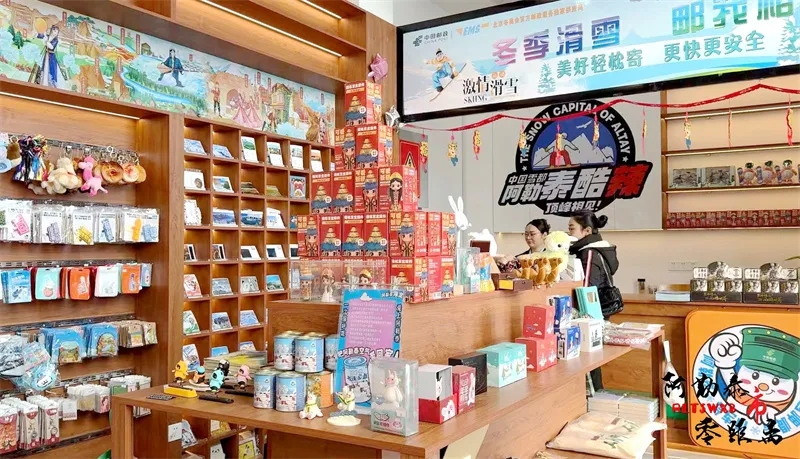 走进雪都邮局,一面墙壁上挂满来自世界各地游客的照片,它们承载着大家的冰雪记忆,除了展出各种文创产品、邮品,这里还有傻老大瓜子、哈纳斯全脂淡奶粉、青河沙棘等当地特产线上线下销售和寄递业务。同样在喀纳斯神秘主题邮局,民族服饰、手撕牛肉、果干等各种当地特色产品琳琅满目。