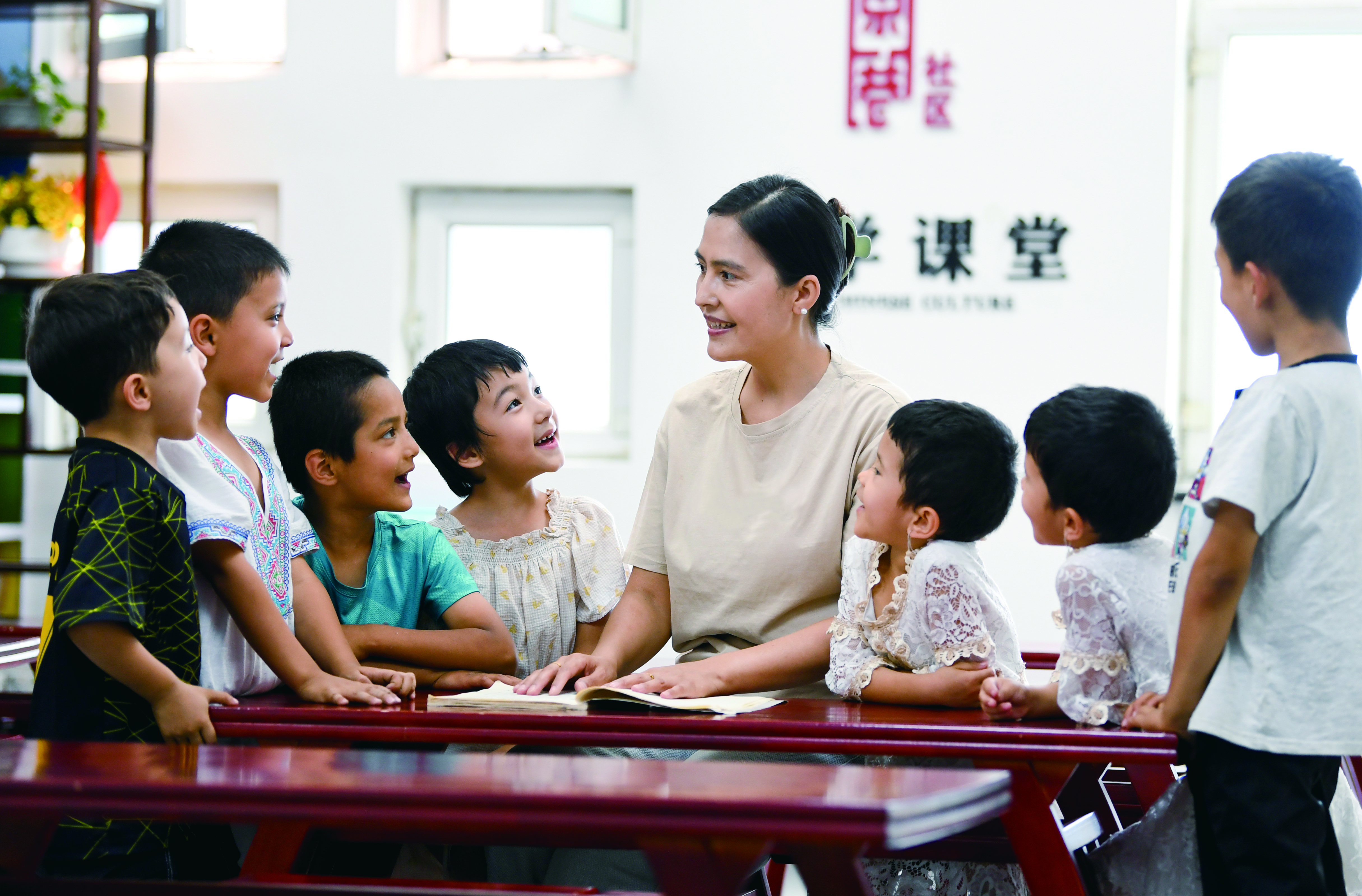 乌鲁木齐市固原巷社区的孩子在跟老师学习诗词。汤永摄