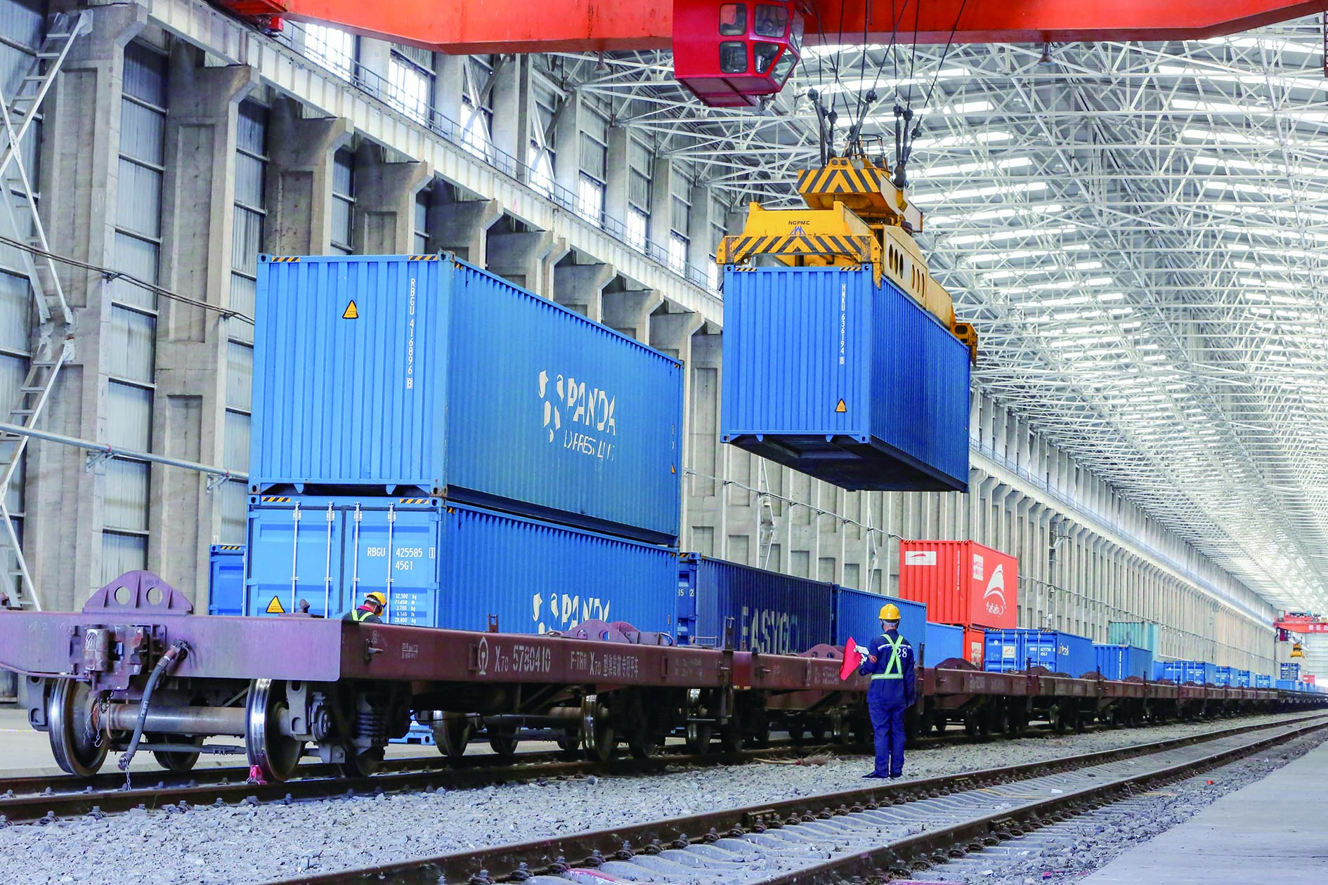 阿拉山口站中欧(中亚)班列换装区行车在吊运集装箱。宋玉龙摄