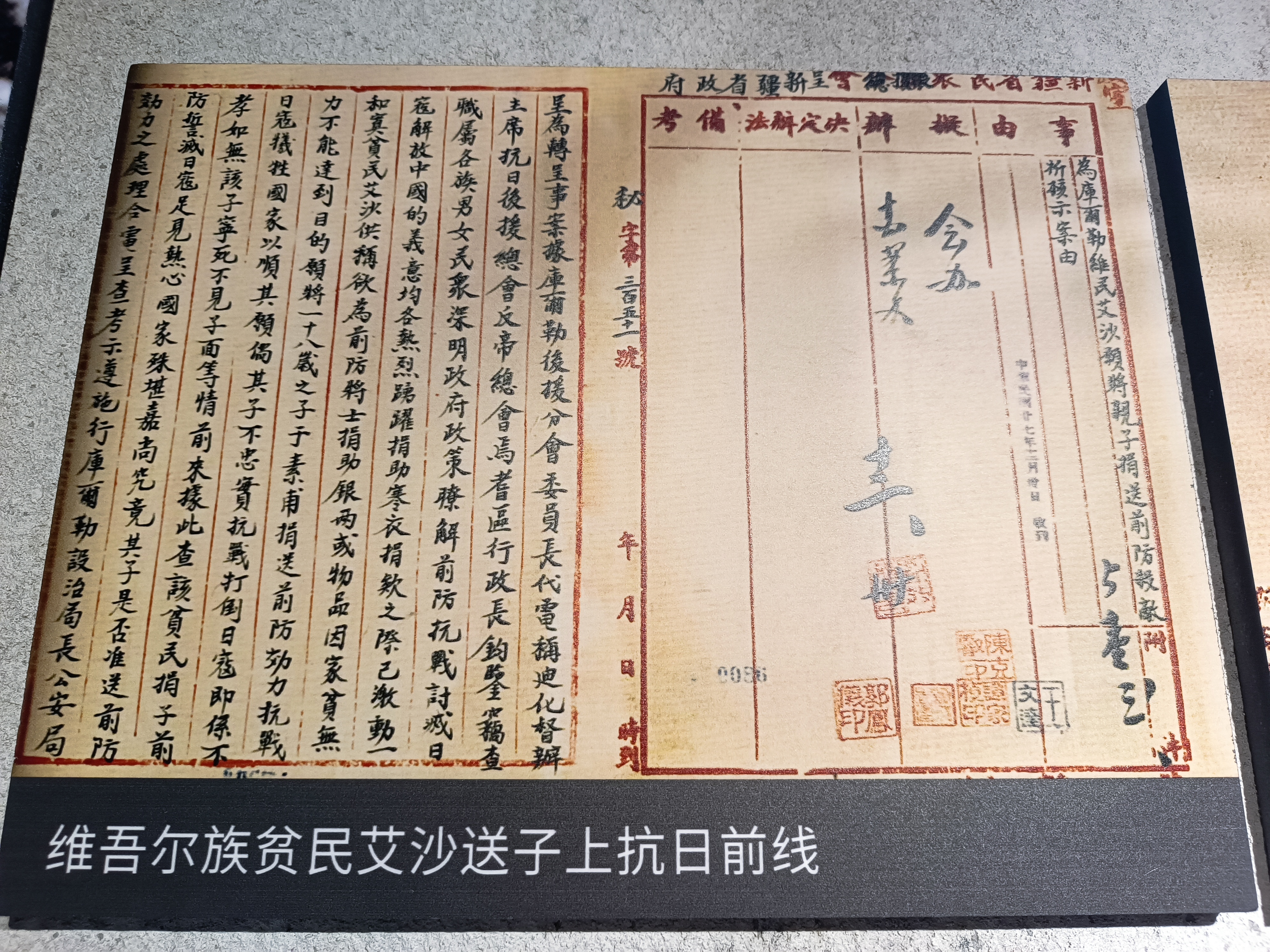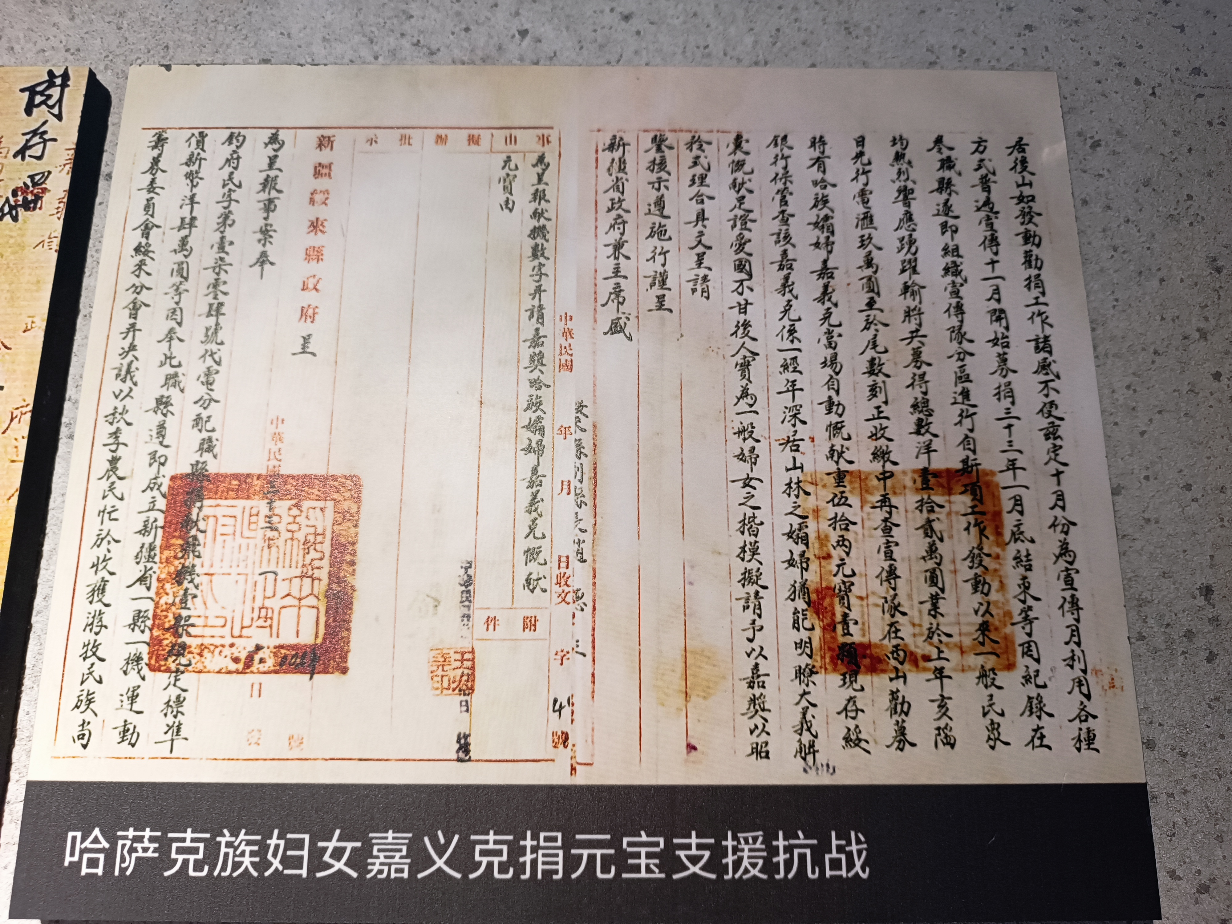 八路军驻新疆办事处纪念馆的展陈记录了抗日战争时期,新疆各族民众慷慨解囊为抗日募捐的历史。石榴云/新疆日报记者 张冬梅摄