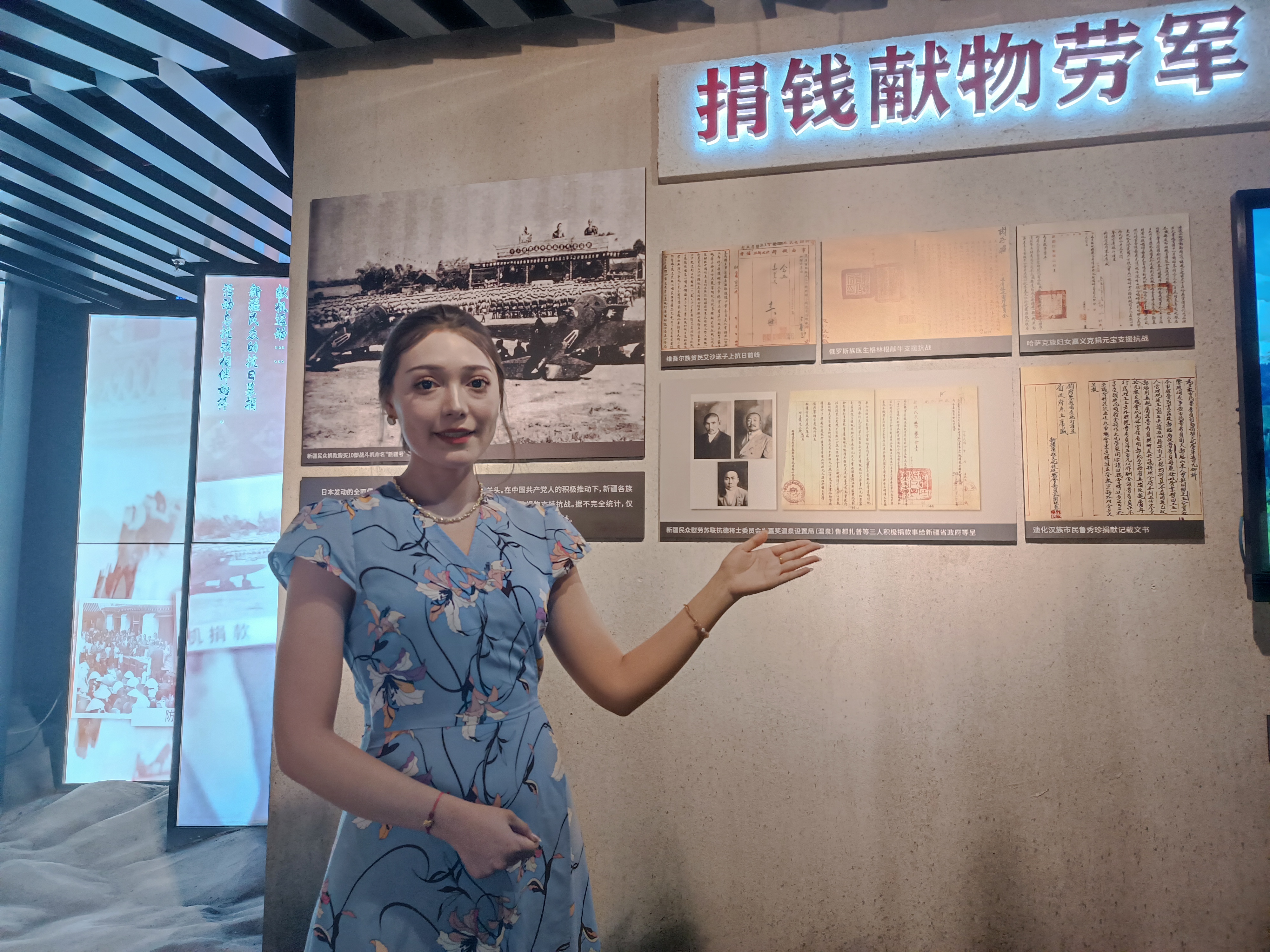 步入八路军驻新疆办事处纪念馆,90后讲解员海丽巴·斯拉吉丁生动地为观众讲述新疆抗日募捐活动中的感人故事。