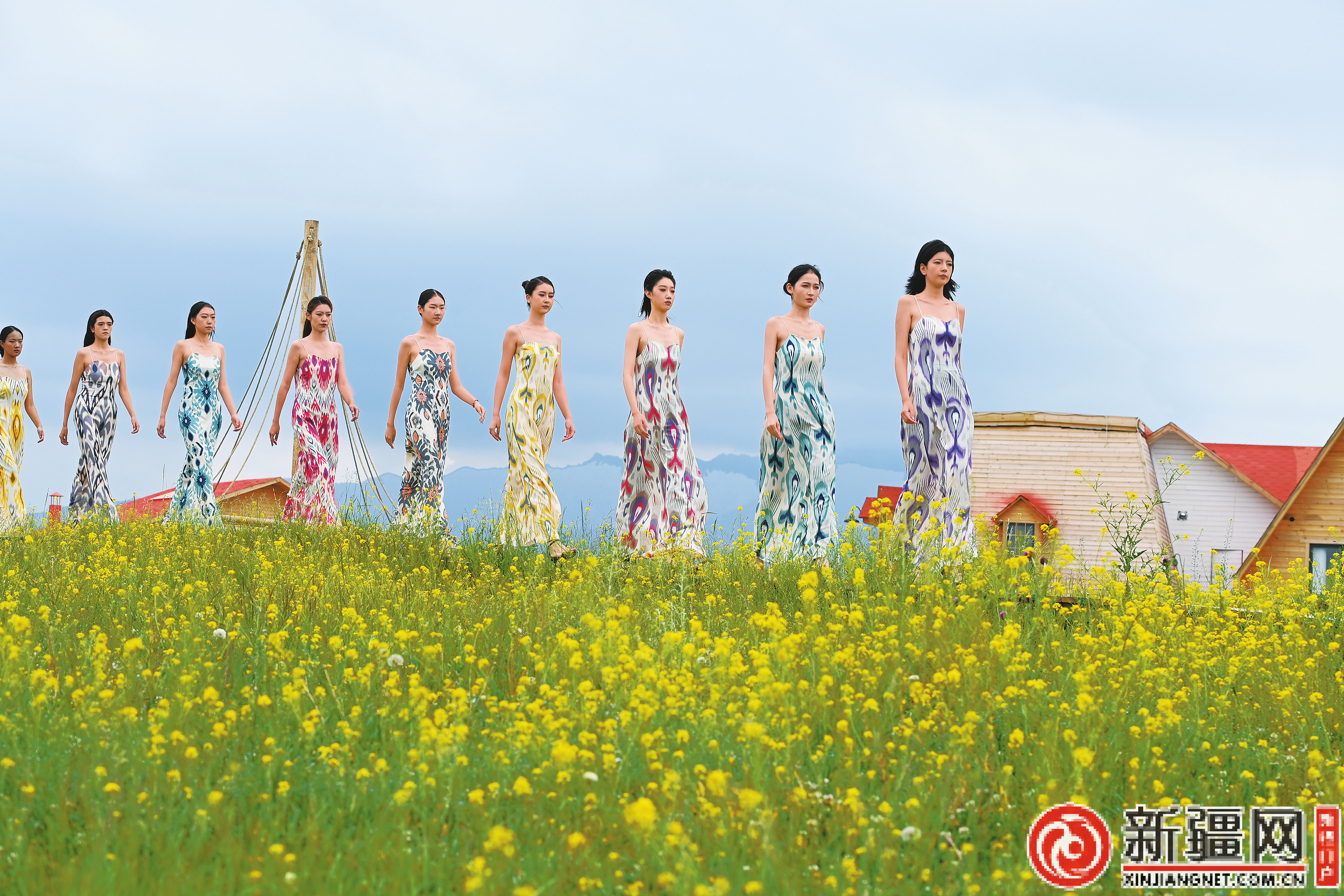 在乌鲁木齐南山牧场乌拉斯台景区,模特身着时尚服饰,漫步于花海中。