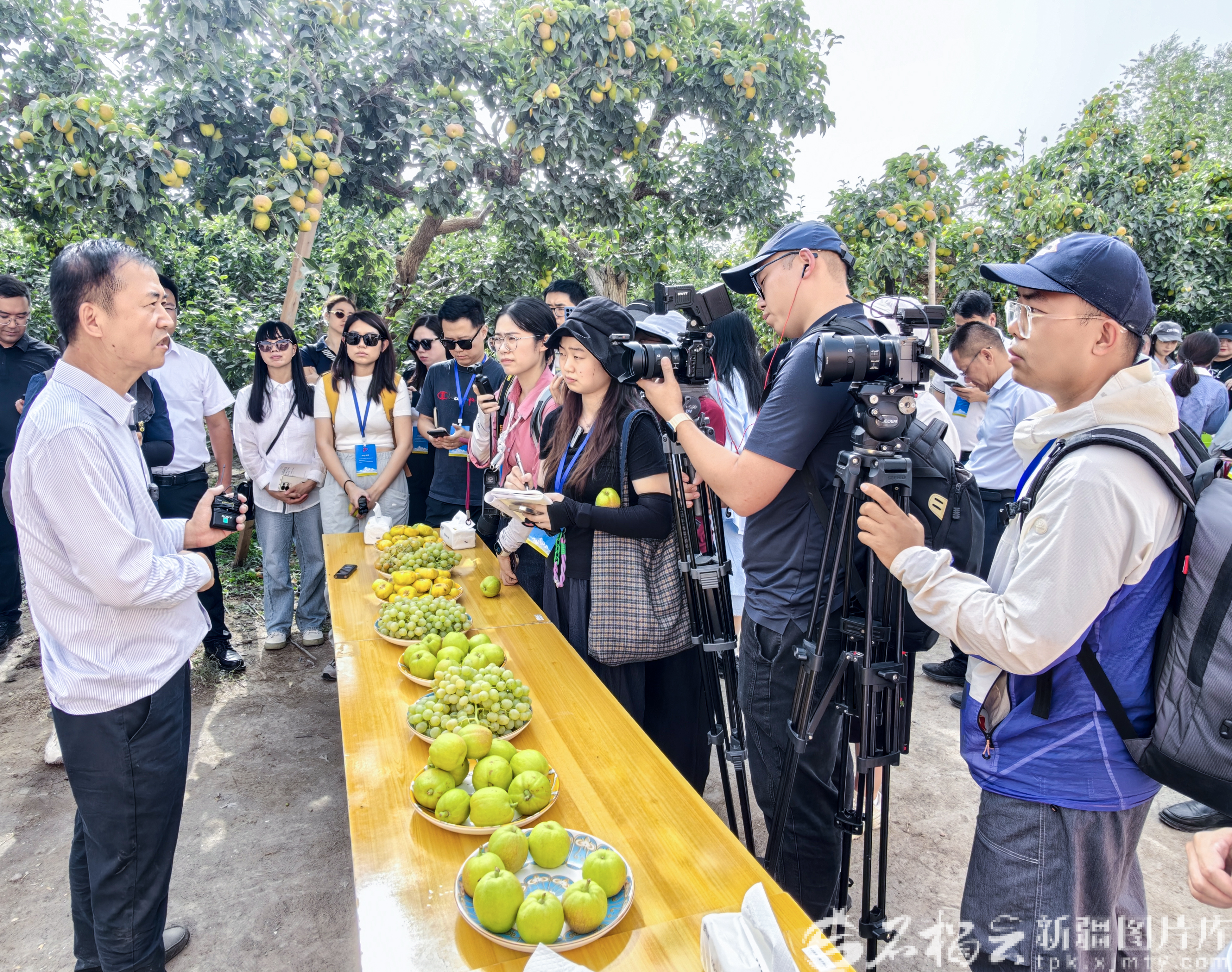 9月8日,采访团记者在阿瓦提乡的梨园采访。