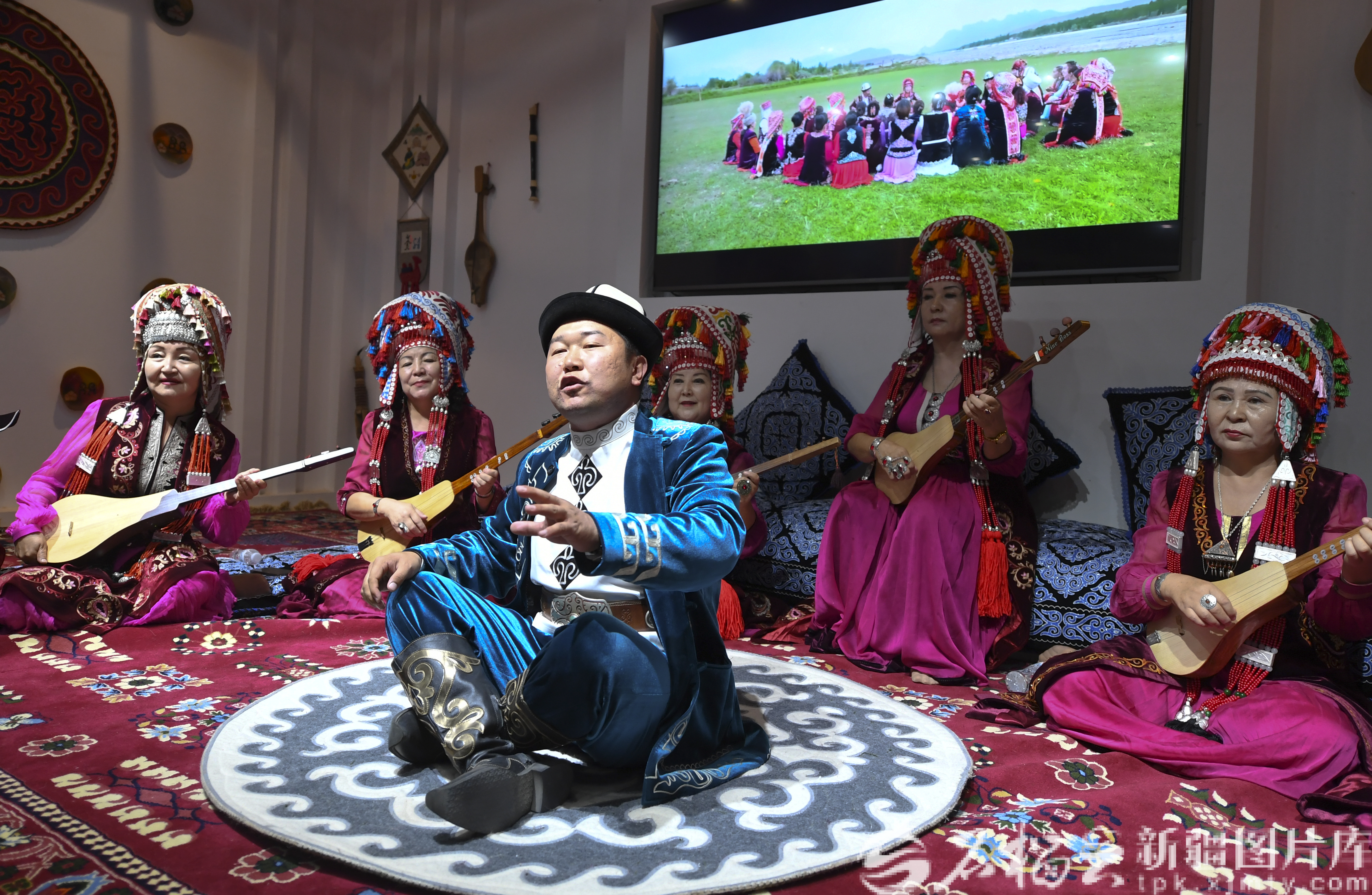 9月12日,民间艺人为参观者弹唱《玛纳斯》。