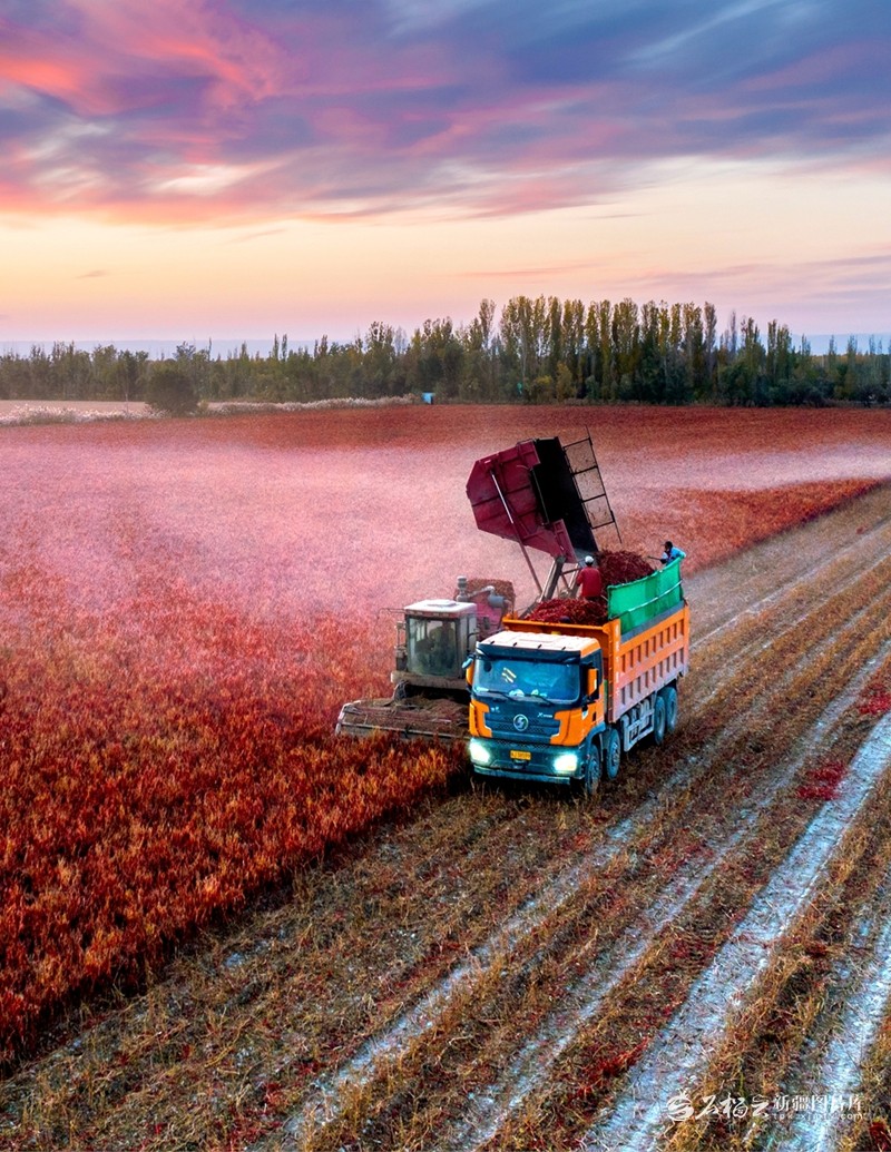 辣椒采收机在克拉玛依市农业综合开发区辣椒种植基地采收辣椒(2022年10月14日摄)。闵勇摄