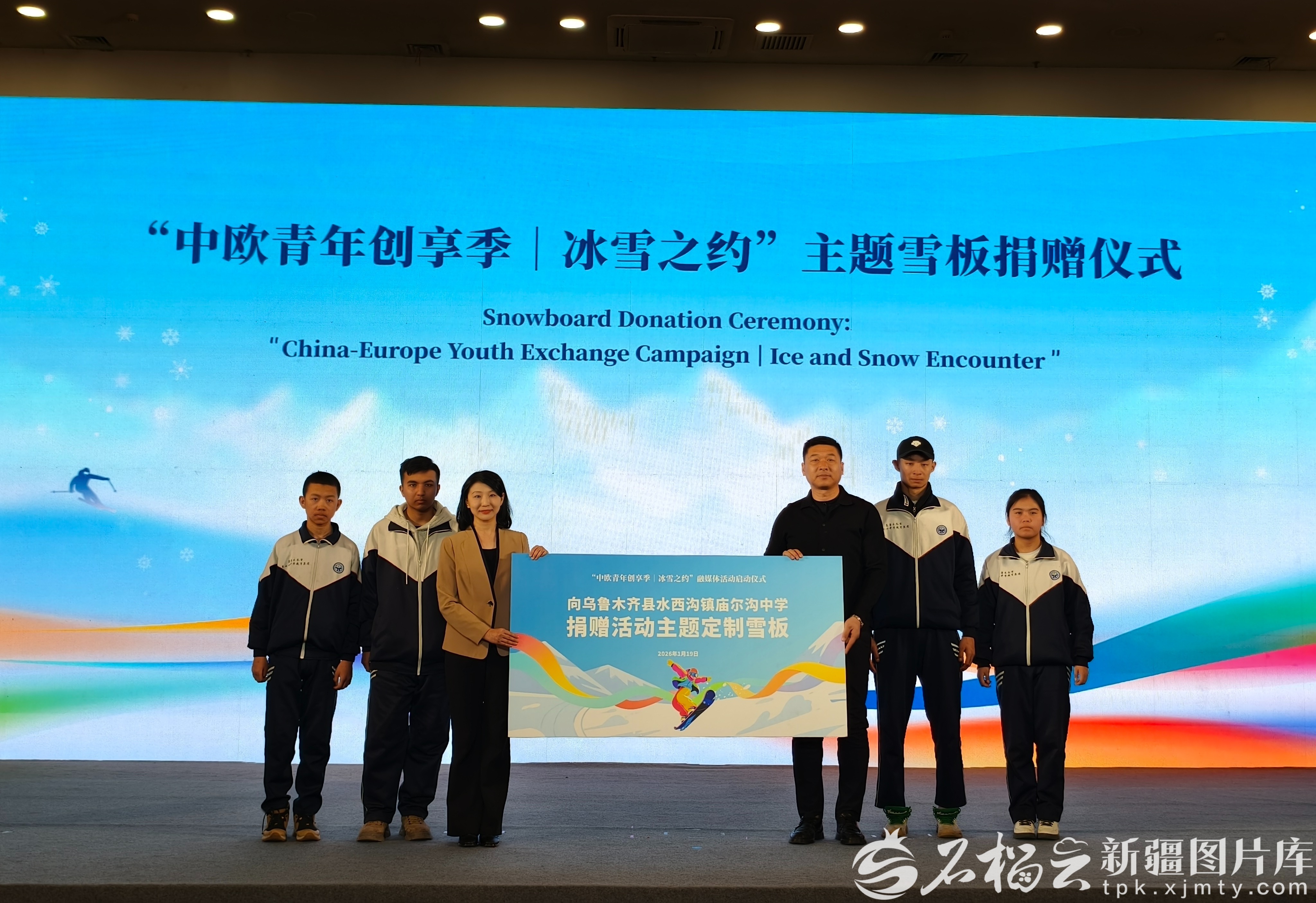 1月19日,“中欧青年创享季丨冰雪之约”融媒体活动在乌鲁木齐启动。活动现场,中央广播电视总台欧洲拉美地区语言节目中心向乌鲁木齐县庙尔沟中学捐赠活动主题定制雪板。天山网-新疆日报记者 李嘉妮摄