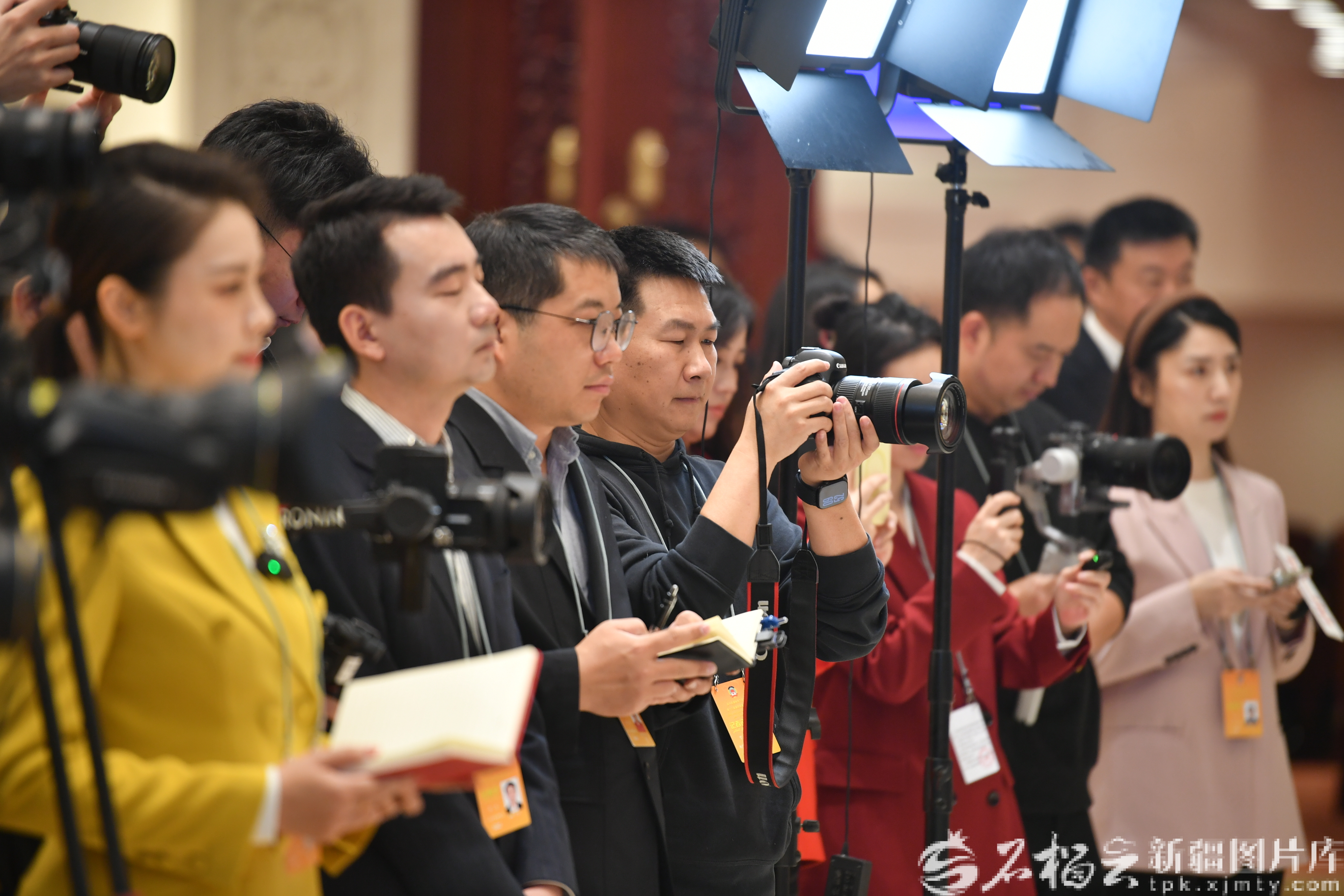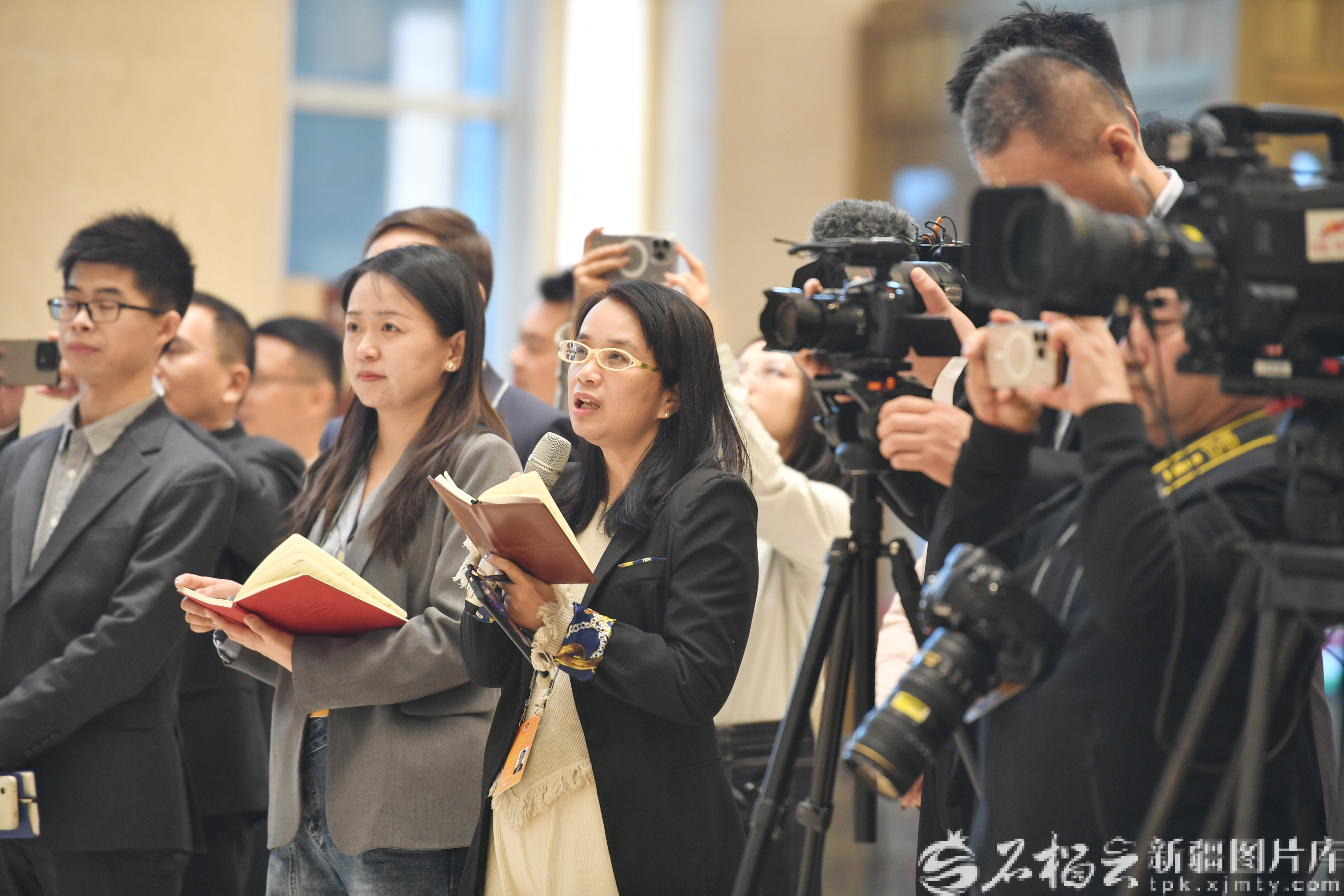 1月26日,自治区政协十三届四次会议“委员通道”集体采访活动现场,石榴云/新疆日报记者在提问。石榴云/新疆日报记者 邹懿摄