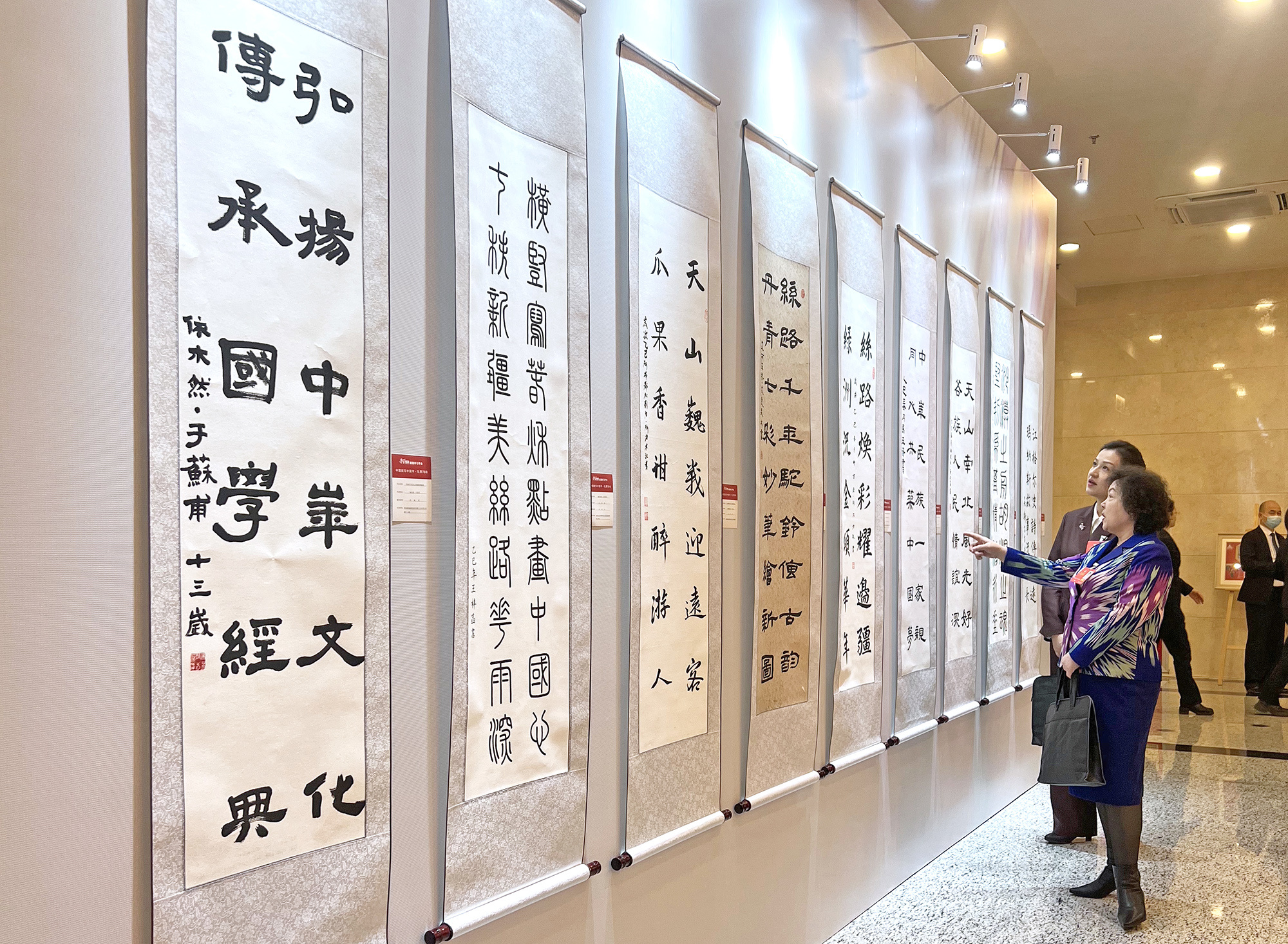 1月26日,出席新疆维吾尔自治区政协十三届四次会议的政协委员在新疆昆仑宾馆观看“童绘新疆”“中国娃写中国字”书画作品成果展。(摄影:邹懿)