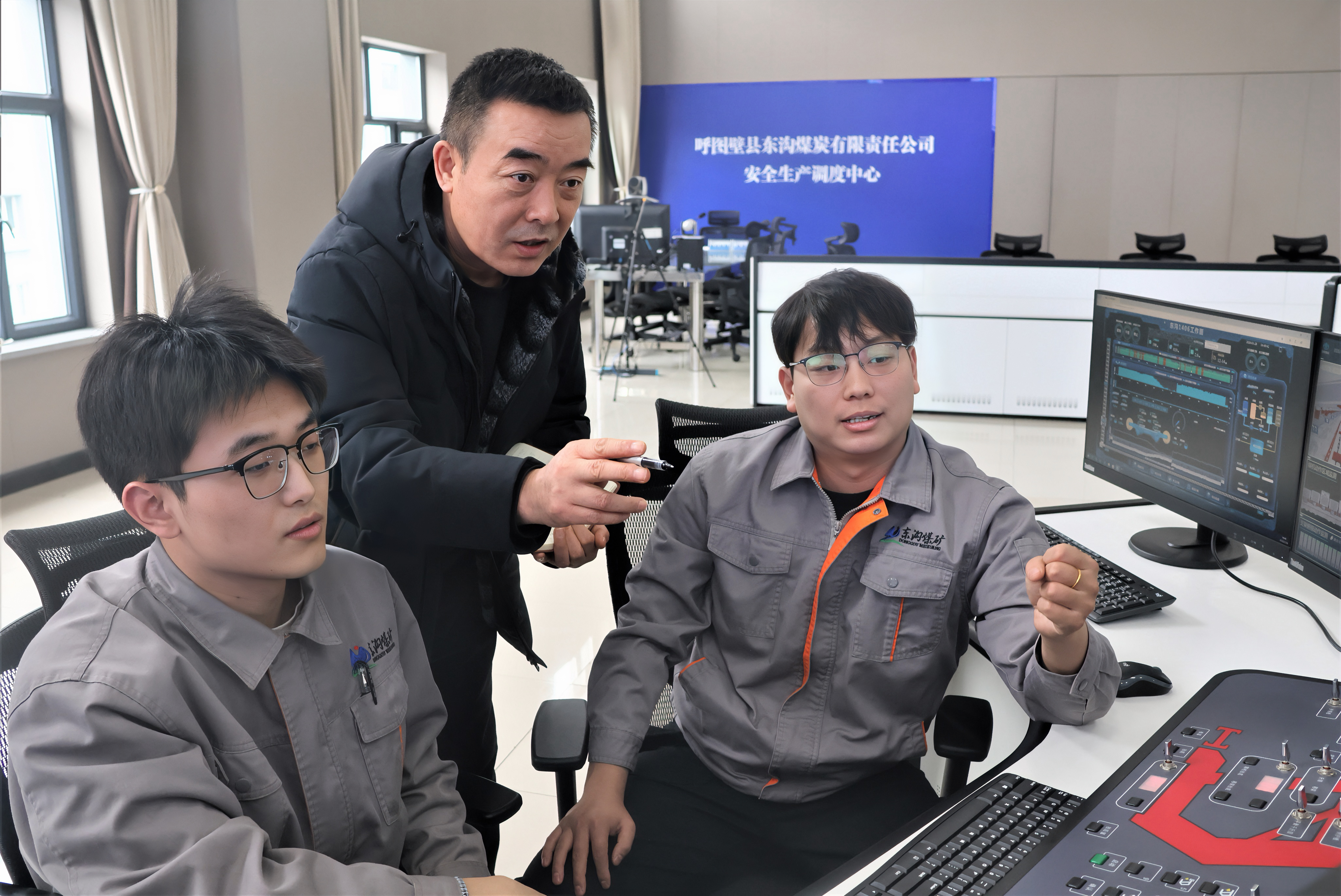 2月1日,天山网-新疆日报记者盖有军(中)在呼图壁县东沟煤炭有限责任公司采访。程勇摄